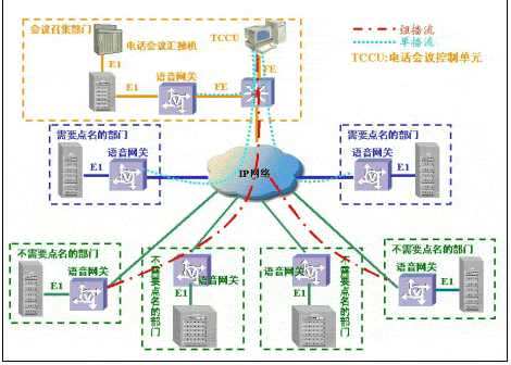 采用原有的會議電話架構(gòu),只是話音的長途連接由模擬專線等改為IP傳輸。方案由于采用原有電話會議匯接機,保護(hù)了用戶的原有投資。缺點是在召開多級會議電話時,由于語音信號首先在召集單位語音網(wǎng)關(guān)進(jìn)行壓縮,經(jīng)IP傳輸后,在二級單位語音網(wǎng)關(guān)解壓縮還原為模擬話音,再經(jīng)二級單位的語音網(wǎng)關(guān)二次壓縮,經(jīng)IP網(wǎng)傳輸后,在三級單位的語音網(wǎng)關(guān)上二次解壓縮,導(dǎo)致語音信號多次壓縮/還原,對語音質(zhì)量損傷較大。