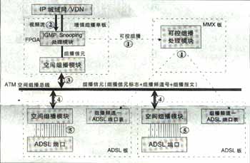 可實現(xiàn)高效的兩級組播;诳臻g總線上的組播信元技術(shù)實現(xiàn),與組播用戶數(shù)無關(guān),同一節(jié)目即使所有用戶加入該頻道,僅需復制一份,不用逐個用戶復制到每個用戶端口,極大節(jié)省了背板帶寬,減輕IP上行負擔?蓪崿F(xiàn)高性能硬件組播轉(zhuǎn)發(fā)。IP上行板采用超大規(guī)模FPGA硬件邏輯處理組播報文,ADSL板采用空間組播處理硬件芯片自動完成向每個ADSL端口(用戶)的組播復制,每ADSL端口組播帶寬6M。