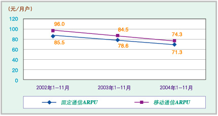 圖二:2002~2004年同期固網通信與移動通信ARPR比較(中國信息產業(yè)部)