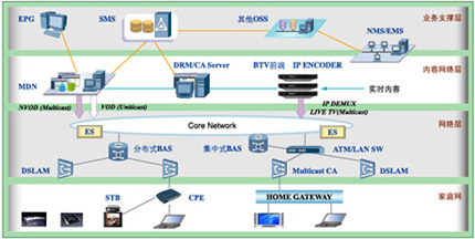 華為IPTV城域網解決方案,由業(yè)務支撐系統、內容網絡系統、骨干承載網、接入網絡幾個部分組成。業(yè)務支撐系統和內容網絡系統實現業(yè)務的管理和提供;網絡層和接入網以及用戶端設備配合完成業(yè)務的接入、控制、管理、QOS保障和安全。
