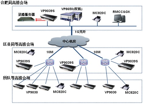 為滿足安徽省煙草合肥市公司日常工作會議、集中培訓(xùn)、遠程匯報等工作業(yè)務(wù)需求,同時為應(yīng)對突發(fā)事件提供可靠可行的交互平臺,實現(xiàn)多地點、遠距離的視頻、音頻和數(shù)據(jù)的互通交流。深圳市金華威數(shù)碼科技有限公司工程師建議新建的視訊系統(tǒng)采用高清的視頻會議組網(wǎng)模式,其中市局、三縣與區(qū)局、所隊及營銷部所有會場節(jié)點建設(shè)高清視頻會議系統(tǒng)。