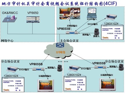 本系統(tǒng)在審計署機房配置網(wǎng)絡控制中心GK、多點資源管理系統(tǒng)和ViewPoint 8660 MCU設備。多點資源管理中心實現(xiàn)對MCU、電視會議和全網(wǎng)資源的統(tǒng)一調度,GK實現(xiàn)對IP終端入會時鑒權認證,在主會場會議室架設一臺ViewPoint 8033B分體式視訊終端。在各分會場會議室架設一臺ViewPoint 8033B分體式視訊終端;在所有會場各架設一臺標清攝像機、一個麥克風、一臺高清電視或一臺高清投影機。