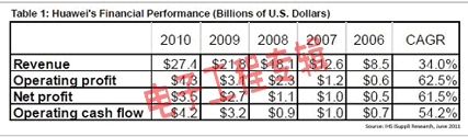 華為已經(jīng)取得了強大的地位,國內(nèi)外銷售均快速增長。該公司過去四年營業(yè)收入增長了兩倍以上,2010年營業(yè)收入從2006年的85億美元上升到274億美元。
