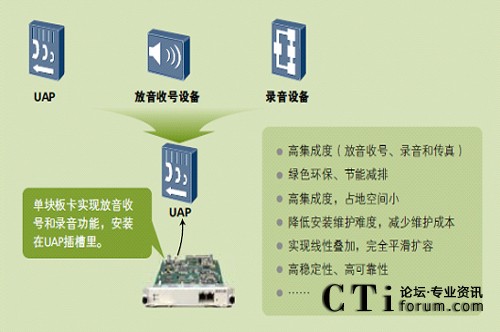隨著全球氣候的變化,低碳經(jīng)濟(jì)已經(jīng)成為關(guān)注焦點(diǎn)。一體化接入平臺(tái)UAP2100內(nèi)置了寬窄帶語音交換和排隊(duì)功能,在僅2U的高度之內(nèi)實(shí)現(xiàn)了寬窄帶中繼接入和錄音、放音等媒體資源處理能力,無需外置媒體服務(wù)器和中繼網(wǎng)關(guān),低能耗元器件的使用和高集成度設(shè)計(jì),有效降低了空間占用和能源消耗,使您在不經(jīng)意間就實(shí)現(xiàn)了綠色聯(lián)絡(luò)中心平臺(tái),降低您可觀的運(yùn)行成本。