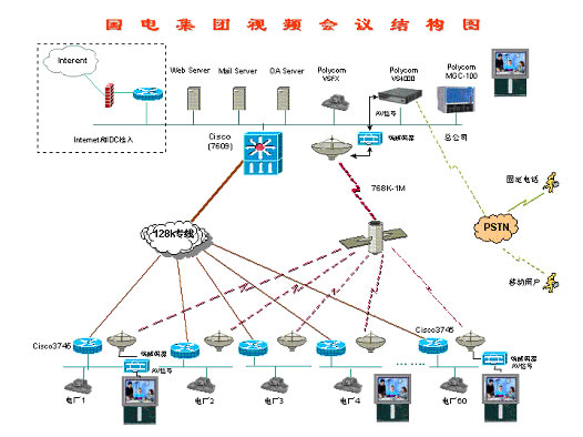 128,集團(tuán)下屬60個(gè)電廠均采用視頻終端ViewStation 128。整個(gè)網(wǎng)絡(luò)采用Polycom MCU的混速功能,在本部中心采用768Kbps進(jìn)行視頻傳輸,和下屬60個(gè)電廠及分公司采用128Kbps進(jìn)行傳輸。由于網(wǎng)絡(luò)傳輸線路分為衛(wèi)星線路和地面有線網(wǎng)絡(luò),衛(wèi)星線路帶寬為768Kbps-1Mbps,用于業(yè)務(wù)下行線路,地面有線網(wǎng)絡(luò)128Kbps用于視頻回傳。根據(jù)網(wǎng)絡(luò)傳輸線路的實(shí)際情況,在本部中心利用1臺視頻終端將其模擬信號(AV信號)送到衛(wèi)星端接設(shè)備(包含MODEM,編解碼器等),將模擬信號轉(zhuǎn)換成數(shù)字信號(MPEG4),利用768K-1Mbps衛(wèi)星線路廣播到每個(gè)接收點(diǎn),通過每個(gè)接收點(diǎn)的編解碼器將數(shù)字信號轉(zhuǎn)換成模擬信號連接到顯示終端(如TV、顯示器)上進(jìn)行收看,通過這種方式可以實(shí)現(xiàn)利用衛(wèi)星線路的高帶寬,并利用其廣播特性,節(jié)省投資。