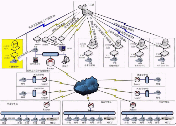 如上圖所示,本系統(tǒng)是一個(gè)由H.323和H.320組成的混合組網(wǎng)的視頻會(huì)議系統(tǒng),總局空管局和華北、華東、東北空管局是通過(guò)地面ATM網(wǎng)絡(luò)傳輸,采用的是H.323協(xié)議組網(wǎng),而中南、西南、西北和新疆空管局及其下屬各個(gè)空管中心(站)采用兩種連接方式,一種是一期建設(shè)的ATM網(wǎng)絡(luò),另一種是衛(wèi)星網(wǎng)絡(luò),衛(wèi)星網(wǎng)絡(luò)采用的是H.320協(xié)議組網(wǎng)。其中,在H.320協(xié)議組網(wǎng)的系統(tǒng)中,終端又可分為雙向通訊終端和單向通訊終端,為了節(jié)約衛(wèi)星通道的租用費(fèi)用,其中4條線路采用雙向通訊方式,剩下線路采用單向接收的方式。