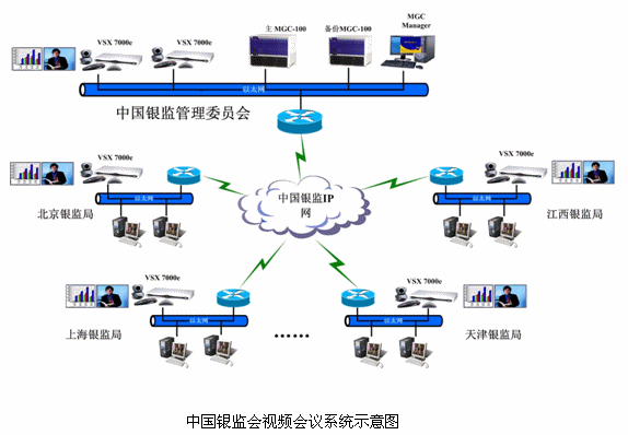 中國銀監(jiān)會目前已經(jīng)擁有一個高速、高可靠性的ATM骨干傳輸網(wǎng)絡(luò),網(wǎng)絡(luò)采用星形結(jié)構(gòu),各分支機構(gòu)到北京總部的線路均為2條15M ATM線路,這種優(yōu)良的網(wǎng)絡(luò)非常適合視頻會議業(yè)務(wù)的運營。視頻會議網(wǎng)建立完成后可以實現(xiàn)通過遠(yuǎn)程視頻會議,遠(yuǎn)程處理重點銀行業(yè)金融機構(gòu)監(jiān)事會的日常管理工作;遠(yuǎn)程審查銀行業(yè)金融機構(gòu)高級管理人員任職資格;遠(yuǎn)程討論協(xié)商制定有關(guān)銀行業(yè)金融機構(gòu)監(jiān)管的規(guī)章制度和辦法;遠(yuǎn)程對銀行業(yè)金融機構(gòu)實監(jiān)管,依法對違法違規(guī)行為進行查處;更加可以通過遠(yuǎn)程雙流會議,按照國家有關(guān)規(guī)定,遠(yuǎn)程公布全國銀行數(shù)據(jù)、報表。