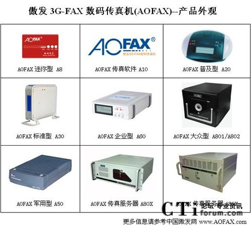 AOFAX系列電腦傳真產(chǎn)品擁有最齊全的型號,包括免費使用的AOFAX傳真軟件A10、SOHO/商旅人士便攜使用的AOFAX迷你型數(shù)碼傳真機A8、單電腦使用的AOFAX普及型數(shù)碼傳真機A20、4用戶環(huán)境的AOFAX標準型電子傳真機A30、軍警使用的AOFAX軍用型傳真系統(tǒng)A50、公安專用傳真服務器A51、營運版網(wǎng)絡(luò)傳真服務期A52、不限用戶數(shù)目的AOFAX企業(yè)型網(wǎng)絡(luò)傳真機A60、1至2線的AOFAX大眾型傳真服務器A801和A802,2至256傳真線路多種規(guī)格的AOFAX專業(yè)型傳真服務器A80X、跨區(qū)域大型公司使用的集團傳真系統(tǒng)和行業(yè)解決方案等,價格從幾百到幾十萬元,可適應各類型客戶的需求,以下為AOFAX全系列產(chǎn)品外觀圖。