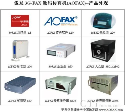 由金恒科技推出的全系列數(shù)碼傳真產(chǎn)品涵蓋了上述三個種類,上圖就是AOFAX無紙傳真產(chǎn)品系列的外形圖。其中迷你型A8和傳真軟件A10屬于第一種,普及型A20、標(biāo)準型A30、軍用型A50和企業(yè)型A60屬于第二種,大眾型A801/A802和專業(yè)型傳真服務(wù)器則屬于第三種。