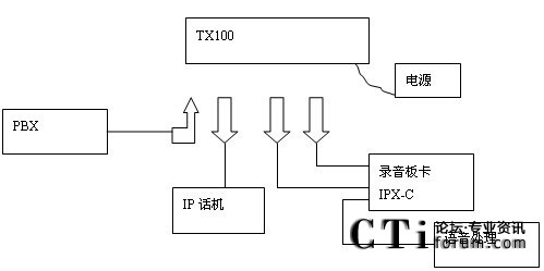 IP話機的錄音示意圖和圖1-4 E1/T1數字線錄音示意圖類似。不過此時PBX與IP話機之間的連線改成網線(RJ45)了。并且在兩個設備之間多了個并接設備TX100,其示意圖如下: