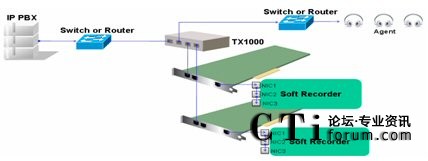 在上圖中,TX1000上Network其中一個端口與交換機鏡像口或Switch設備直接相連,Network的另一個端口與另一個switch相連,該switch下相連好多IP話機。Monitor中的ATx端口與一塊IP錄音板卡相連,另一端口BTx與第二塊IP錄音板卡相連。這樣就做到了IP錄音的冗余備份。