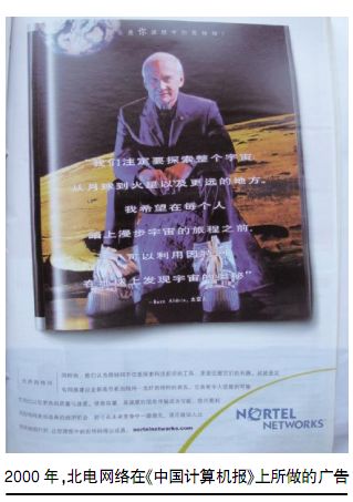 2000年,北電網(wǎng)絡在《中國計算機報》上所做的廣告 1995年,北電開始從電話制造公司向網(wǎng)絡設計、構建及集成公司的演變。起初,業(yè)界分析人士對此予以奚落,認為這是一家電信商膚淺的裝飾門面之舉。一位分析師曾尖銳地稱之為“一群四十多歲的人穿著跳迪斯科的衣服”。