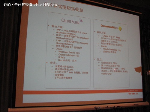 還有一個(gè)客戶是澳大利亞聯(lián)邦銀行(Commonwealth Bank)。該公司選用Oracle Database 11g和Oracle數(shù)據(jù)庫(kù)云服務(wù)器,開(kāi)發(fā)了一個(gè)名為“Oracle即服務(wù)”的PaaS,將300個(gè)中小型數(shù)據(jù)庫(kù)環(huán)境整合到3個(gè)網(wǎng)格中。目前該銀行運(yùn)營(yíng)成本減少50%,根據(jù)需要就可從資源池中獲取CPU,實(shí)現(xiàn)了靈活性, 在第1年即實(shí)現(xiàn)盈虧平衡。