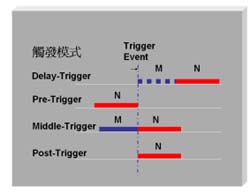 edge)觸發(fā)或是下降緣(falling)觸發(fā),另外,在觸發(fā)的模式上也有幾種不同的區(qū)別,分別是延遲觸發(fā)(delay-trigger)、預觸發(fā)(pre-trigger)