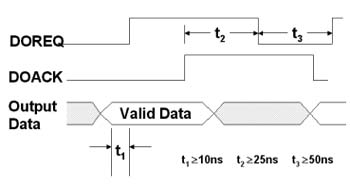 在上圖中,當有效數(shù)據(jù)在緩沖存儲器中等待被輸出時,此時板卡上DOREQ的信號準位會被拉高,以通知接收端輸出數(shù)據(jù)已經被送出,當接收端收到數(shù)據(jù)時,則會產生DOACK的信號通知發(fā)送端數(shù)據(jù)已完成接收,發(fā)送端收到此一信號后,即將DOREQ準位拉低,并等待下一筆要輸出的數(shù)據(jù),而不斷重復上述步驟,直到將所有數(shù)據(jù)輸出完成。所以當兩個支持交握信號的模塊在數(shù)據(jù)傳輸時,其正確的接線方式為將輸出端的ACK訊號線與輸入端的REQ訊號線相聯(lián)接,輸出端的REQ訊號線與輸入端的ACK訊號線相聯(lián)接。凌華科技的PCI-7300A高速數(shù)字I/O卡,支持外部時脈及完整的信號交握傳輸,其最高傳輸速度達80MB/sec,數(shù)據(jù)長度可依使用者的需求設定為8、16、及32