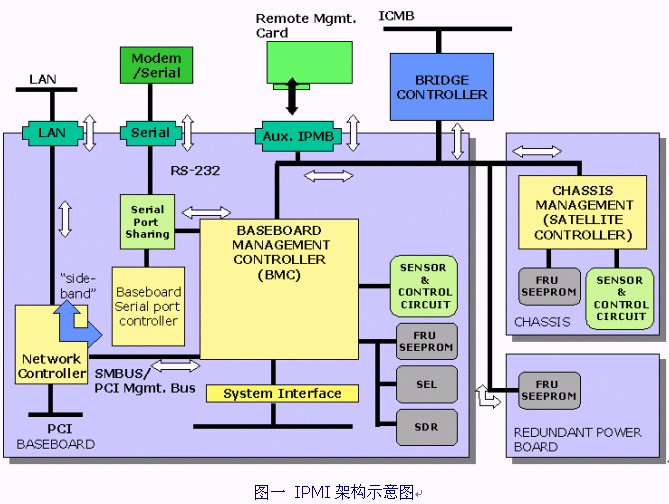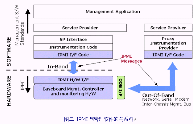 由圖二我們可以看出,IPMI的界面以及上層的管理都需求一些軟件來支持,以下將簡(jiǎn)略的描述IPMI所涉及到的軟硬件種類:
