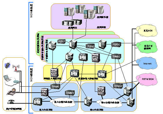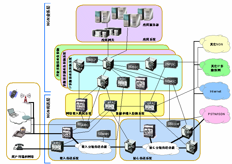 NGN是基于分組技術(shù)和多層網(wǎng)絡(luò)結(jié)構(gòu)的未來電信網(wǎng)絡(luò)。它可支持所有可能的業(yè)務(wù),包括使用各種媒體類型和轉(zhuǎn)播方式的、具有不同性能要求的業(yè)務(wù)。它的業(yè)務(wù)與傳送分離、控制與用戶數(shù)據(jù)處理分離的構(gòu)架允許網(wǎng)絡(luò)中各個部件可分別配備和獨(dú)立發(fā)展。業(yè)務(wù)的提供采用具有開放接口的業(yè)務(wù)平臺,可以為第三方業(yè)務(wù)提供者所使用。傳送層采用可支持不同帶寬和端到端QoS能力的技術(shù)。NGN控制功能可分布于現(xiàn)有和新的網(wǎng)絡(luò)基礎(chǔ)設(shè)施上并可按組網(wǎng)的要求采用不同的組合形式。網(wǎng)關(guān)提供NGN不同域之間或NGN和現(xiàn)有網(wǎng)絡(luò)之間的互通。NGN支持通用移動性,使用戶或其他移動體無論其位置或技術(shù)環(huán)境的變化都能進(jìn)行通信和接入業(yè)務(wù)。它允許用戶可以跨越不同的有線或無線接入技術(shù),跨越現(xiàn)有網(wǎng)絡(luò)的界限使用他們的業(yè)務(wù)。| AGC Access Gateway Controller AMC Access Management Controller AMG Access Media Gateway AS Application Server BGC Breakout Gateway Controller MAG Multimedia Access Gateway MGC Media Gateway Control Function MGW Media Gateway MMS Mobility Management Subsystem MRC Multimedia Resource Controller MRP Multimedia Resource Processor NAAS Network Access Attachment Subsystem |