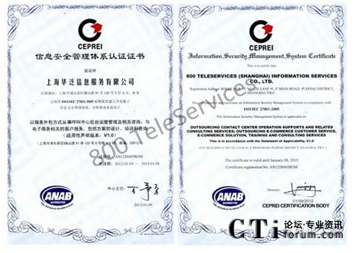 CTI論壇(ctiforum)1月31日消息(記者 浩宇):2012年1月,著名的服務(wù)外包呼叫中心和電子商務(wù)運營中心企業(yè)--飛翱集團(tuán)旗下全資子公司上海華泛信息服務(wù)有限公司---,繼2009年獲得ISO9001 質(zhì)量管理體系國際認(rèn)證后。經(jīng)過半年嚴(yán)格的綜合考評,再次成功獲得又一由國際上公認(rèn)的ISO/IEC 27001:2005(也簡稱為:ISO27001)并獲得具有美國認(rèn)證機構(gòu)國家認(rèn)可委員會ANAB授予的雙重信息安全管理體系認(rèn)證。
