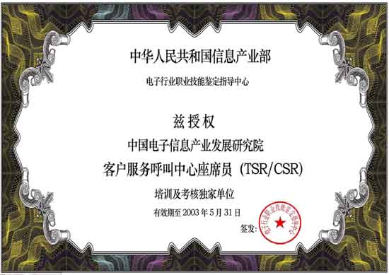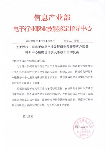 中國電子信息產業(yè)發(fā)展研究院職業(yè)技能培訓部是中國電子信息產業(yè)發(fā)展研究院旗下專業(yè)從事IT職業(yè)技能培訓的機構。呼叫中心職業(yè)技能培訓工作是培訓中心常年開展的主要培訓項目。培訓中心受信息產業(yè)部委托,負責全國范圍內"呼叫中心客戶服務座席員"的授權培訓及考核工作。既是呼叫中心行業(yè)基礎操作人員培訓及考核的權威機構,又是配合行業(yè)管理、全面支撐和提升整個呼叫中心產業(yè)的服務機構。