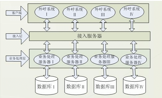 針對舊外呼業(yè)務系統(tǒng)的弊端及業(yè)務系統(tǒng)特點,賽迪呼叫研發(fā)了基于三層C/S結(jié)構(gòu)的外呼業(yè)務系統(tǒng),該系統(tǒng)分客戶端,接入服務器,業(yè)務服務器及數(shù)據(jù)庫端?蛻舳税l(fā)送請求給分配服務器,接受到請求后,分配服務器根據(jù)客戶端的請求數(shù)據(jù)將其分配給自身的業(yè)務服務器做業(yè)務處理,這樣客戶端與業(yè)務服務器建立起聯(lián)系,結(jié)構(gòu)體系如圖: