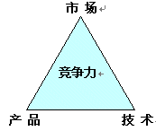企業(yè)要發(fā)展, 關(guān)鍵于企業(yè)的核心競爭力, 企業(yè)如何具有核心競爭力, 特別是通信企業(yè), 我認為, 通信企業(yè)要具有核心競爭力, 決定于三個因素: 市場, 產(chǎn)品, 技術(shù). 這三個因素構(gòu)筑企業(yè)強大競爭力---競爭力三角型. 三角型的邊則是產(chǎn)品經(jīng)理的活動軌道. 圖1-1