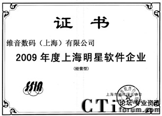 CTI論壇(ctiforum)10月19日消息: 金秋十月,捷報(bào)頻傳,由上海市軟件行業(yè)協(xié)會(huì)開(kāi)展的2009年度上海明星軟件企業(yè)評(píng)選結(jié)果出爐,維音數(shù)碼不僅榮登:“2009年度上海明星軟件企業(yè)(經(jīng)營(yíng)型)”和“2009年度上海明星軟件企業(yè)(創(chuàng)新型)”獲獎(jiǎng)榜單,維音數(shù)碼自主研發(fā)的軟件產(chǎn)品VisionCTI(計(jì)算機(jī)電話(huà)集成系統(tǒng))更是被評(píng)定為“2009年度上海市優(yōu)秀軟件產(chǎn)品獎(jiǎng)”。