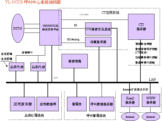 宇龍UCCS呼叫中心系統(tǒng)是分布式處理系統(tǒng),系統(tǒng)采用了功能 模塊化設(shè)計方法。每一項(xiàng)功能如語音信箱功能、IVR功能乃至傳真功能都可以很方便的從系統(tǒng)中鏈入或鏈出。