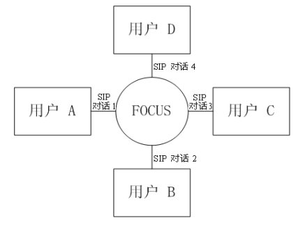 緊耦合會議的邏輯架構(gòu)圖如圖三所示。會議中的核心是“會議中心(conference focus)”,每一個會議都有一個會議中心,由一個URI標(biāo)識,用戶通過聯(lián)系這個URI參加到一個會議中去。會議中心和用戶之間的拓?fù)浣Y(jié)構(gòu)為星性結(jié)構(gòu)。會議中心為用戶提供并維持一個信令連接,并且可以執(zhí)行會議策略,實現(xiàn)對會議的控制和管理。