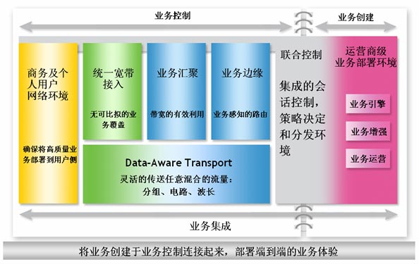 首先,我們提供了智能的、具備業(yè)務(wù)感知能力的、安全的融合網(wǎng)絡(luò):這意味著通過安全的網(wǎng)絡(luò)將正確的業(yè)務(wù)部署到正確的客戶端,并保證最高體驗(yàn)質(zhì)量。它的本質(zhì)是在網(wǎng)絡(luò)的各個層面部署智能化和業(yè)務(wù)感知的元素,并實(shí)施完整的安全機(jī)制,正如我們前面提到的,業(yè)務(wù)演進(jìn)與網(wǎng)絡(luò)間相互有著緊密關(guān)聯(lián),為達(dá)到業(yè)務(wù)需求,網(wǎng)絡(luò)需要能夠根據(jù)業(yè)務(wù)進(jìn)行靈活調(diào)整。