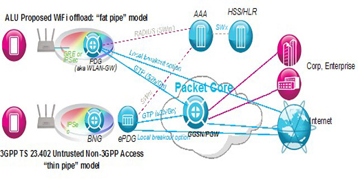 上述方案解決了WiFi分流的認(rèn)證問題,上海貝爾的方案中,將WLAN的GW功能引入到7750 SR業(yè)務(wù)路由器上,該功能通過7750 SR上的AA-ISA多業(yè)務(wù)板卡實(shí)現(xiàn)。WiFi分流為確保安全性,在3GPP TS 23.402中,對WiFi終端的接入,采取了一種所謂瘦管道的模式,即要從用戶端向網(wǎng)關(guān)發(fā)起IP-Sec連接,而AP僅充當(dāng)橋的作用,對于PC或平板電腦等終端,這不是什么問題,但對于手機(jī)而言,IP-Sec將帶來非常大的負(fù)荷,不僅影響終端上應(yīng)用的相應(yīng)速度,同時(shí)對電池的消耗非常之大,就目前情況看,市場上支持該功能的手機(jī)非常少。上海貝爾的方案中,采用了胖管道的模式,通過從AP向網(wǎng)關(guān)建立IP-Sec或GRE隧道,顯著降低了對移動終端的要求,不僅使得移動終端的成本得以下降,同時(shí)延長了終端的使用時(shí)間,更重要的是,擴(kuò)大了運(yùn)營商推廣WiFi 分流方案的適用群體。