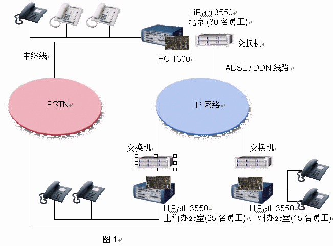 西門子推薦該公司每一個(gè)辦公室均采用HiPath 3550 PBX。如果,A公司每個(gè)辦公室已經(jīng)擁有DDN專線或ADSL連接至Internet,它就能將其內(nèi)部通信建設(shè)在現(xiàn)存的IP網(wǎng)絡(luò)的基礎(chǔ)之上。其集成網(wǎng)關(guān)HiPath 1500被用來(lái)連接數(shù)據(jù)網(wǎng)絡(luò)和語(yǔ)音網(wǎng)絡(luò)。在這樣的網(wǎng)絡(luò)架構(gòu)中,路由冗余能夠得到充足的保證,因?yàn)槲鏖T子HiPath解決方案提供了最大的網(wǎng)絡(luò)存活性:即使IP網(wǎng)絡(luò)出現(xiàn)故障,西門子網(wǎng)絡(luò)設(shè)置能夠?qū)⒙酚勺詣?dòng)切換至PSTN之上。
