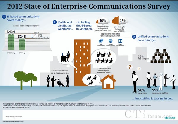 “此項研究的發(fā)現(xiàn)證實了我們從客戶那里得來的反饋:基于IP的統(tǒng)一通信不僅提高了終端用戶的生產(chǎn)效率,還節(jié)約了公司成本,”西門子企業(yè)通信北美區(qū)總裁兼全球市場總監(jiān)Chris Hummel說,“企業(yè)通信正處于從PBX到IP以及從客戶機房到云部署的過渡時期。西門子企業(yè)通信致力于為我們的客戶提供靈活開放的企業(yè)通信解決方案,以適應(yīng)其業(yè)務(wù)需要。這有助于降低IT技術(shù)的復雜性,更好地支持企業(yè)員工的移動性需求,并幫助企業(yè)完成這種轉(zhuǎn)變。”