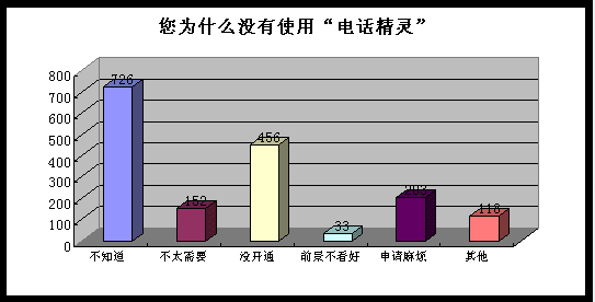 尚有相當多地區(qū)沒有開通此類服務,用戶感到遺憾。在“您為什么沒有使用‘電話精靈’?”的統(tǒng)計結果中“當?shù)貨]有開通”是一項主要原因,有不少用戶都留言希望能將電話精靈業(yè)務在更廣泛地區(qū)應用。曾經(jīng)使用過“電話精靈”,但后期由于運營商停止了此項業(yè)務而不再使用的用戶也深感遺憾。