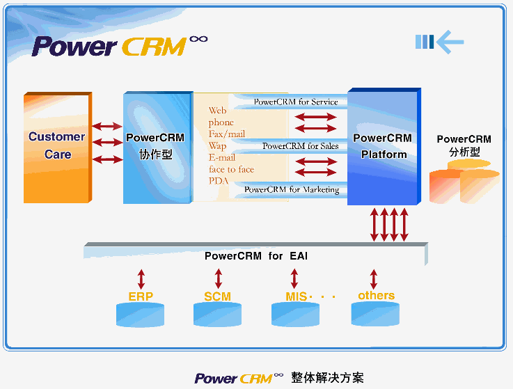 創(chuàng)智集團(tuán)投入巨資,推出的PowerCRM是一套完全基于WEB方案的企業(yè)級(jí)的客戶關(guān)系管理應(yīng)用系統(tǒng)。是中國(guó)第一款自主開發(fā)的具有大容量數(shù)據(jù)處理能力,具有大型系統(tǒng)定制能力,針對(duì)中高端用戶、大型企業(yè)(通信行業(yè)、金融、證券、保險(xiǎn)行業(yè)、制造業(yè)、零售業(yè)、服務(wù)行業(yè)、顧問(wèn)咨詢行業(yè)、IT行業(yè)等)解決方案,是國(guó)家計(jì)委高技術(shù)產(chǎn)業(yè)化示范工程。盡管已有不少國(guó)內(nèi)軟件廠商紛紛推出自己的CRM,但僅停留在“入門級(jí)”水平,只能為中小企業(yè)提供傳統(tǒng)的、以運(yùn)營(yíng)型為主的CRM解決方案,雖然也可以幫助企業(yè)用戶處理好客戶關(guān)系,提高工作效率,但難以帶來(lái)贏利。PowerCRM將自己主要的競(jìng)爭(zhēng)對(duì)手定位于Siebel, Oracle等知名的國(guó)際級(jí)公司的產(chǎn)品。同過(guò)不斷地優(yōu)化產(chǎn)品設(shè)計(jì),爭(zhēng)取奉獻(xiàn)給國(guó)內(nèi)企業(yè)客戶功能最強(qiáng)大,性能價(jià)格比最高,最符合中國(guó)企業(yè)特色的CRM產(chǎn)品。