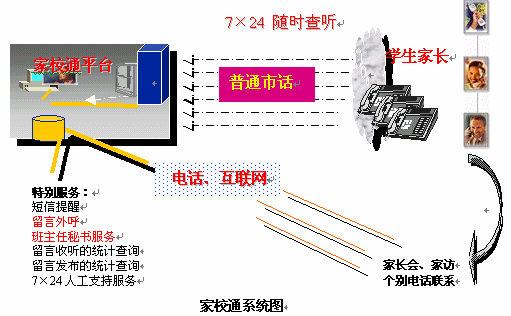 捷通華聲從關(guān)愛(ài)青少年成長(zhǎng)出發(fā),提出了應(yīng)用于教育領(lǐng)域溝通平臺(tái)"家校通"系統(tǒng)的語(yǔ)音服務(wù)解決方案。家校通系統(tǒng)是一個(gè)融合了語(yǔ)音合成、計(jì)算機(jī)網(wǎng)絡(luò)集成綜合服務(wù)、互聯(lián)網(wǎng)、數(shù)據(jù)庫(kù)等多種先進(jìn)IT技術(shù)為一體的新一代家校聯(lián)系工具。它充分利用互聯(lián)網(wǎng)與目前最為普及的公眾電話等資源,為學(xué)校提供多樣化的信息發(fā)布渠道,同時(shí)強(qiáng)大的7×24小時(shí)的留言發(fā)布和查聽(tīng)服務(wù)功能,為老師和家長(zhǎng)提供一種全新、高效、便捷的交流方式,大大提高了家長(zhǎng)的滿意度,提升了學(xué)校的管理實(shí)力。