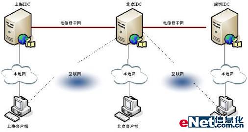 上圖為單服務(wù)器和多服務(wù)器的部署比較(虛線為單服務(wù)器的訪問模式),可以看到,使用多服務(wù)器部署后,客戶端可以使用本地網(wǎng)進入系統(tǒng),對于網(wǎng)絡(luò)質(zhì)量優(yōu)化有很大的優(yōu)勢。另外,服務(wù)器間音視頻流的傳輸將不會出現(xiàn)數(shù)據(jù)冗余現(xiàn)象,對于減少骨干網(wǎng)的壓力也有益處。