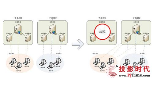 當(dāng)一個子系統(tǒng)出現(xiàn)故障時,系統(tǒng)可以自動將故障子系統(tǒng)上的會議遷移到其他子系統(tǒng)上,做到子系統(tǒng)互為備份,極大提高了系統(tǒng)的運行支撐能力。