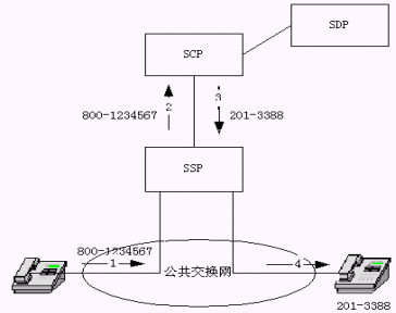 該圖示業(yè)務工作過程如下:(1)主叫用戶撥800號號碼,(2)SSP向SCP查詢800號號碼,(3)SCP查詢數(shù)據(jù)庫后向SSP送回譯碼結(jié)果(真正被叫號碼),(4)SSP連接主、被叫,振鈴。