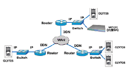 在這幾個(gè)不同的辦公地點(diǎn)的會議室分別配置一臺視頻會議終端設(shè)備,在主會議室中再配置一臺多點(diǎn)控制單元MCU,即可實(shí)現(xiàn)商業(yè)用戶在同城的幾個(gè)辦公室之間進(jìn)行視頻通信。該方案的組網(wǎng)非常簡單,不需要企業(yè)租用電信的線路,也不需要多購買其他網(wǎng)絡(luò)設(shè)備,只需為每臺設(shè)備分配私有的IP地址,就能實(shí)現(xiàn)視頻通信。
