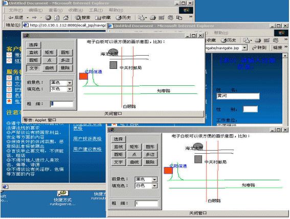 電子白板功能是在語(yǔ)音文字交談之外,ICWEB為用戶(hù)提供的圖形交談工具。電子白板允許多個(gè)在線用戶(hù)同時(shí)在界面里繪制刪除任意圖形,寫(xiě)字、插入圖片以及用標(biāo)志工具標(biāo)示某些區(qū)域。電子白板功能可以有效地補(bǔ)充文本交談功能所不具備的圖示功能。