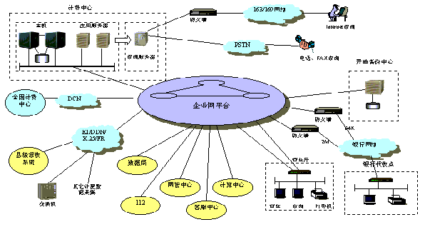 計(jì)費(fèi)中心聯(lián)機(jī)采集交換機(jī)的計(jì)費(fèi)數(shù)據(jù),以及其它業(yè)務(wù)的計(jì)費(fèi)數(shù)據(jù)。城區(qū)的交換機(jī)就近連入企業(yè)網(wǎng),采用E1/DDN/X.25等各種聯(lián)網(wǎng)方式。各縣交換機(jī)的計(jì)費(fèi)數(shù)據(jù)可先匯總到縣計(jì)費(fèi)中心,然后再通過“九七”網(wǎng)絡(luò)傳到計(jì)費(fèi)中心。