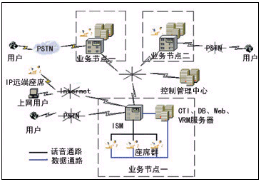 包括遠(yuǎn)端坐席和近端坐席,完成業(yè)務(wù)的受理,為用戶(hù)提供所需服務(wù)。近端座席通常與ISM采用一般話路方式連接。根據(jù)座席情況,遠(yuǎn)端座席可以通過(guò)多種方式來(lái)實(shí)現(xiàn)。其中最靈活的方式是通過(guò)Internet接入呼叫中心平臺(tái)的IP遠(yuǎn)端座席。