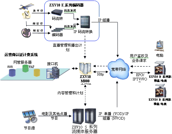中興通訊ZXV10 IPTV/VOD整體解決方案是專門針對電信運營商多媒體服務而設計的綜合解決方案。該系統(tǒng)可提供網(wǎng)絡電視(IPTV)、視頻點播(VOD)、準視頻點播(NVOD)、電子節(jié)目指南(EPG)等多種寬帶多媒體業(yè)務,系統(tǒng)全面支持xDSL和FTTx接入,支持MPEG2、MPEG4、WMV9等多種視音頻格式,在為運營商提供具有極高競爭力的、特色鮮明服務的同時,最大限度地提高運營商的收入。