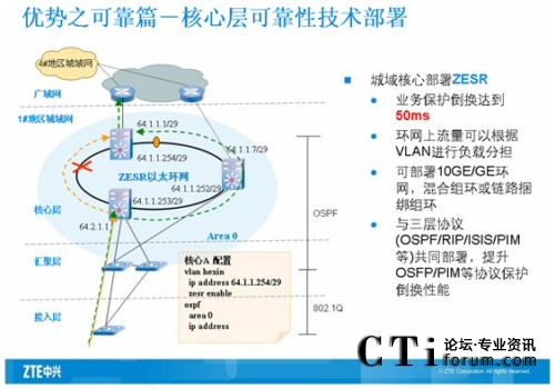 核心交換機主要是匯聚下行的全千兆智能路由交換機,所以要求設(shè)備提供高密度板卡和線速轉(zhuǎn)發(fā)的能力。同時保證對下行端口進(jìn)行帶寬控制,中興采用萬兆路由交換機ZXR10 8905來滿足用戶的需求。ZXR10 8900系列萬兆路由交換機是中興通訊推出的新一代的大容量核心/匯聚路由交換機系列產(chǎn)品,主要定位于運營商IP城域網(wǎng)、校園網(wǎng)、電子政務(wù)網(wǎng)和大型企事業(yè)網(wǎng)等網(wǎng)絡(luò)的核心/匯聚層。ZXR10 8900系列萬兆路由交換機基于先進(jìn)的模塊化理念進(jìn)行設(shè)計,并采用了基于多處理器并行處理機制和Crossbar空分交換結(jié)構(gòu)的體系結(jié)構(gòu),關(guān)鍵模塊均采用可以1:1進(jìn)行冗余備份。ZXR10 8900系列具備10GE、GE、FE等各種豐富的接口模塊,并全面支持IPv4、IPv6、組播、QOS、帶寬控制等業(yè)務(wù)功能。ZXR10 8900系列整個系統(tǒng)所具備的高可靠性、高擴展性、良好的業(yè)務(wù)能力等特點,可以滿足各種網(wǎng)絡(luò)核心/匯聚層的建設(shè)需求。