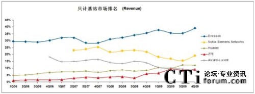 CTI論壇(ctiforum)4月16日消息(記者 潘婷婷): 近日,業(yè)內(nèi)著名調(diào)研公司Infonetics發(fā)布了2009年全球無線通信設備市場研究報告《2G/3G Mobile Infrastructure and Subscribers》。根據(jù)報告顯示,2009年全年,全球無線通信市場份額出現(xiàn)了較大變化,按載頻計,中興通訊全年以12.6%的全球市場份額超越阿爾卡特-朗訊,居行業(yè)第4,按載頻計,2009年全球無線設備出貨市場份額排名為愛立信、華為、諾基亞-西門子、中興、阿爾卡特-朗訊,分別為28.2%,22.1%,19%,12.6%和9.2%。
