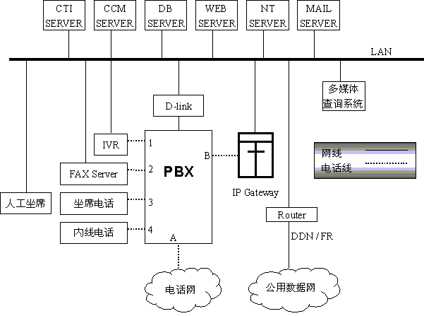上圖所示的分布于不同地區(qū)的多個(gè)系統(tǒng)可以互相聯(lián)接,構(gòu)成分布式客戶(hù)服務(wù)中心,如地市話(huà)務(wù)員回答不了客戶(hù)的問(wèn)題,可轉(zhuǎn)接到省中心,話(huà)務(wù)員在坐席上操作請(qǐng)求CCM轉(zhuǎn)接省中心,CCM通過(guò)CTI SERVER控制PBX將A與B接通,IP網(wǎng)關(guān)響應(yīng)呼叫,將電話(huà)號(hào)碼信號(hào)翻譯成相關(guān)的IP地址,將線(xiàn)路上的語(yǔ)音信號(hào)處理成數(shù)據(jù)信息并打包,通過(guò)本地LAN、本地ROTUER、公用數(shù)據(jù)網(wǎng)、省中心LAN等發(fā)送到省中心的IP網(wǎng)關(guān)、呼叫到達(dá)省中心PBX的B,按省中心系統(tǒng)的排隊(duì)和選擇坐席的規(guī)則選擇坐席,省中心的IP網(wǎng)關(guān)將接收到的數(shù)據(jù)解包還原成語(yǔ)音信號(hào)通過(guò)B送坐席電話(huà)3,雙方通話(huà)。這樣全省各市縣將聯(lián)結(jié)成一個(gè)大的分布式呼叫中心,同時(shí)IP電話(huà)也可用于企業(yè)內(nèi)部通信,通信費(fèi)將降至原來(lái)的一半以下。