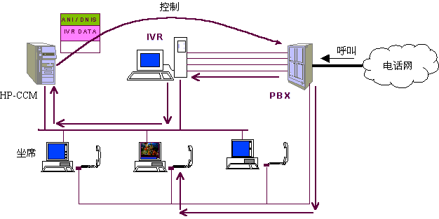在任何一個(gè)步驟中,如客戶(hù)選擇了人工坐席,則IVR請(qǐng)求CCM根據(jù)多種情況選擇一個(gè)空閑坐席(選擇方法見(jiàn)下文)并控制PBX將呼叫與選擇的人工坐席接通,同時(shí)系統(tǒng)在客戶(hù)對(duì)IVR操作的過(guò)程中,已經(jīng)幀測(cè)到了客戶(hù)所使用的電話(huà)號(hào)碼、客戶(hù)的按鍵信息,系統(tǒng)還記錄有客戶(hù)上次的呼叫情況等數(shù)據(jù),這些數(shù)據(jù)基本上可以確定客戶(hù)大體關(guān)心的問(wèn)題,對(duì)于老客戶(hù)甚至可以初步認(rèn)定呼叫者的身份、年齡、性別、業(yè)務(wù)辦理情況等,因此,話(huà)務(wù)員在與客戶(hù)談話(huà)之前就已經(jīng)了解了相當(dāng)多的信息,并控制選定的坐席屏幕顯示有關(guān)客戶(hù)信息,便于直接進(jìn)入正題,提高了效率?蛻(hù)與坐席的交流過(guò)程中,坐席可通過(guò)終端請(qǐng)求CCM控制PBX將本次呼叫與其他話(huà)務(wù)員(坐席)、專(zhuān)家或業(yè)務(wù)辦公室(如內(nèi)線(xiàn)電話(huà))等接通,當(dāng)坐席人員將呼叫轉(zhuǎn)移到另一坐席或?qū)<視r(shí),系統(tǒng)將在本呼叫中收集的各類(lèi)數(shù)據(jù)同時(shí)轉(zhuǎn)向下一坐席電腦。在坐席人員解答客戶(hù)問(wèn)題時(shí),可將問(wèn)題及解答情況收集,便于分析坐席人員的業(yè)務(wù)素質(zhì)和問(wèn)題傾向,從而有針對(duì)性地培訓(xùn)坐席人員。對(duì)于客戶(hù)來(lái)講,他可以通過(guò)電話(huà)按鍵在話(huà)務(wù)員、自動(dòng)語(yǔ)音、傳真、專(zhuān)家和業(yè)務(wù)辦公室之間漫游,系統(tǒng)將記錄客戶(hù)漫游的路徑,對(duì)于設(shè)計(jì)較好的菜單和路經(jīng)來(lái)說(shuō),客戶(hù)的漫游路徑基本上可以反映出其需求,大量客戶(hù)的漫游路徑無(wú)疑將反映出市場(chǎng)需求。