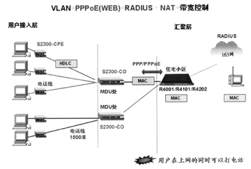 圖2所示的是VDSL技術(shù)與以太網(wǎng)技術(shù)聯(lián)合打造的新型接入方案。武漢烽火網(wǎng)絡(luò)公司生產(chǎn)的S2300系列VDSL交換機使用戶在現(xiàn)有電話線路上獨立享用固定的獨立的帶寬,安全地進行數(shù)據(jù)連接,同時以太網(wǎng)的PPPoE認證、NAT地址變換等功能又將用戶帶入迷幻的網(wǎng)絡(luò)世界。