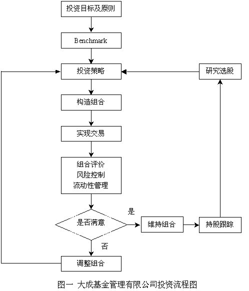 程序化是公司持續(xù)、健康發(fā)展的首要基礎(chǔ),也是公司擴大規(guī)模、規(guī)范管理的必要條件。大成選擇了清晰而明確的投資流程(見圖一)。