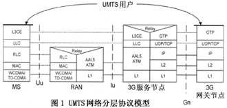 對圖1的簡要描述如下:移動(dòng)用戶(MS)到RAN左側(cè)部分是無線接入網(wǎng)絡(luò)的無線用戶接口(Uu),實(shí)現(xiàn)了用戶業(yè)務(wù)通過空中無線鏈路接入3G網(wǎng)絡(luò)的功能,主要包含物理層(采用WCDMA和TD-CDMA技術(shù))、媒體接入層(MAC)、無線鏈路層(RLC);在RAN內(nèi)部通過協(xié)議中繼(Relay)實(shí)現(xiàn)無線鏈路和有線鏈路的對接;在RAN和3G服務(wù)節(jié)點(diǎn)之間的接口(Iu)是以ATM技術(shù)為支撐的有線接入段協(xié)議,為支持Internet業(yè)務(wù),采用AAL5適配層協(xié)議,物理層(L1)無明確限定具體傳輸方式;在此之上,透過RAN、MS和3G服務(wù)節(jié)點(diǎn)之間存在兩個(gè)高層連接,即邏輯聯(lián)絡(luò)層(LLC)和更為復(fù)雜的第三層實(shí)體(L3CE),L3CE是一些以Client/Server方式構(gòu)件的軟件實(shí)體,實(shí)現(xiàn)諸如無線資源管理、呼叫控制、移動(dòng)管理等網(wǎng)絡(luò)級功能;在3G服務(wù)節(jié)點(diǎn)內(nèi)部,為實(shí)現(xiàn)到Internet網(wǎng)絡(luò)的接入,再作一次協(xié)議中繼,這里,第三層實(shí)體的信息映射到通用分組無線服務(wù)的隧道協(xié)議GTP(GPRS Tunneling Protocol);3G服務(wù)訪問點(diǎn)到3G網(wǎng)關(guān)之間的Gn接口存在清晰的、以TCP/IP協(xié)議為主體的五層對應(yīng)關(guān)系;構(gòu)建在最上層的是移動(dòng)用戶到3G網(wǎng)關(guān)的UMTS用戶進(jìn)程,它通過3G網(wǎng)關(guān)進(jìn)入Internet骨干網(wǎng),最終實(shí)現(xiàn)用戶對Internet的訪問。